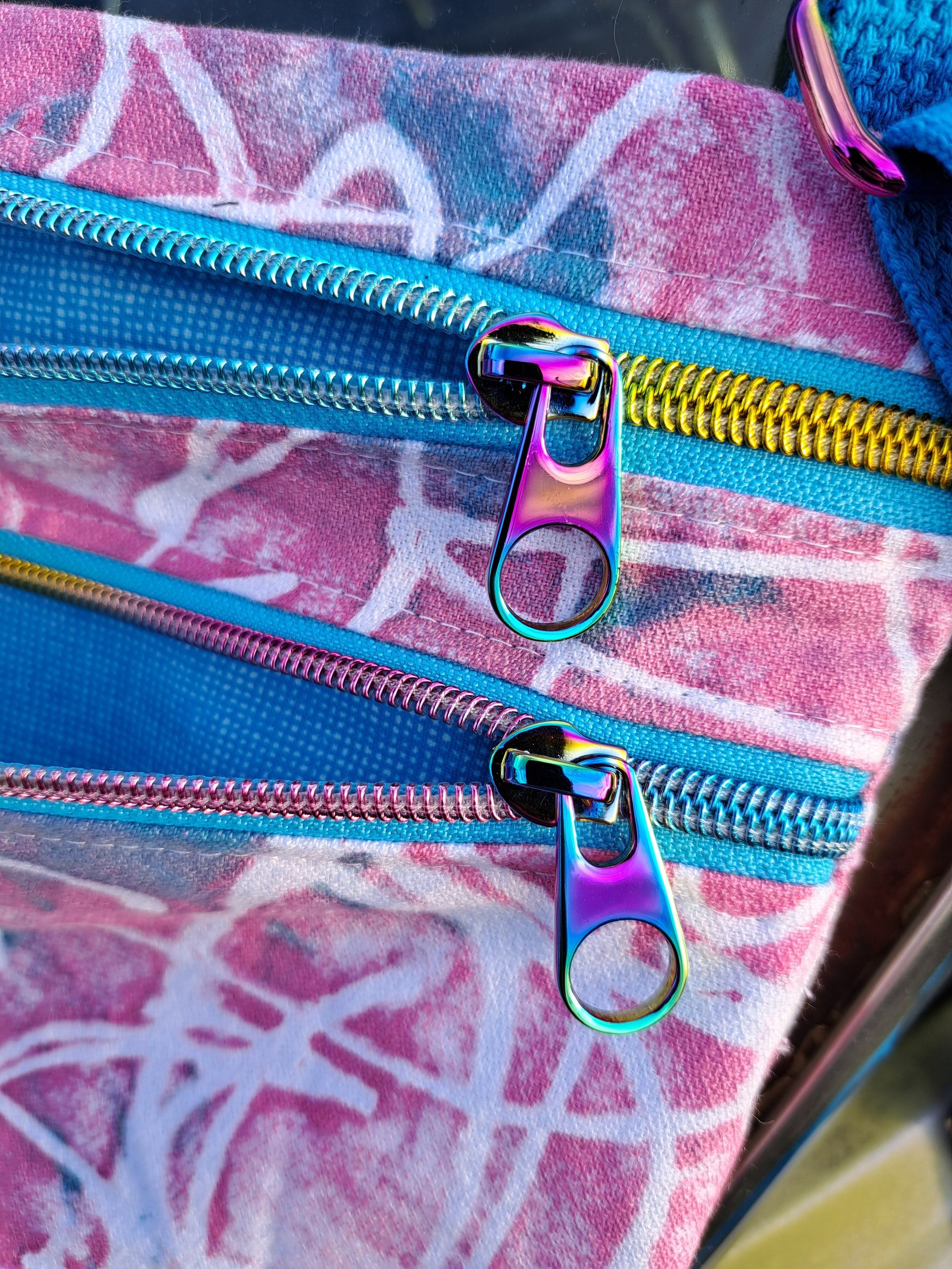 Pink White Teal Resist Print Rainbow Two Zip Crossbody Bag