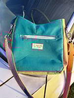 Dazzle everyone with this one of a kind rainbow pieced cork bag. It features a rainbow front with aqua back and pieced rainbow strap with natural silver cork gusset.