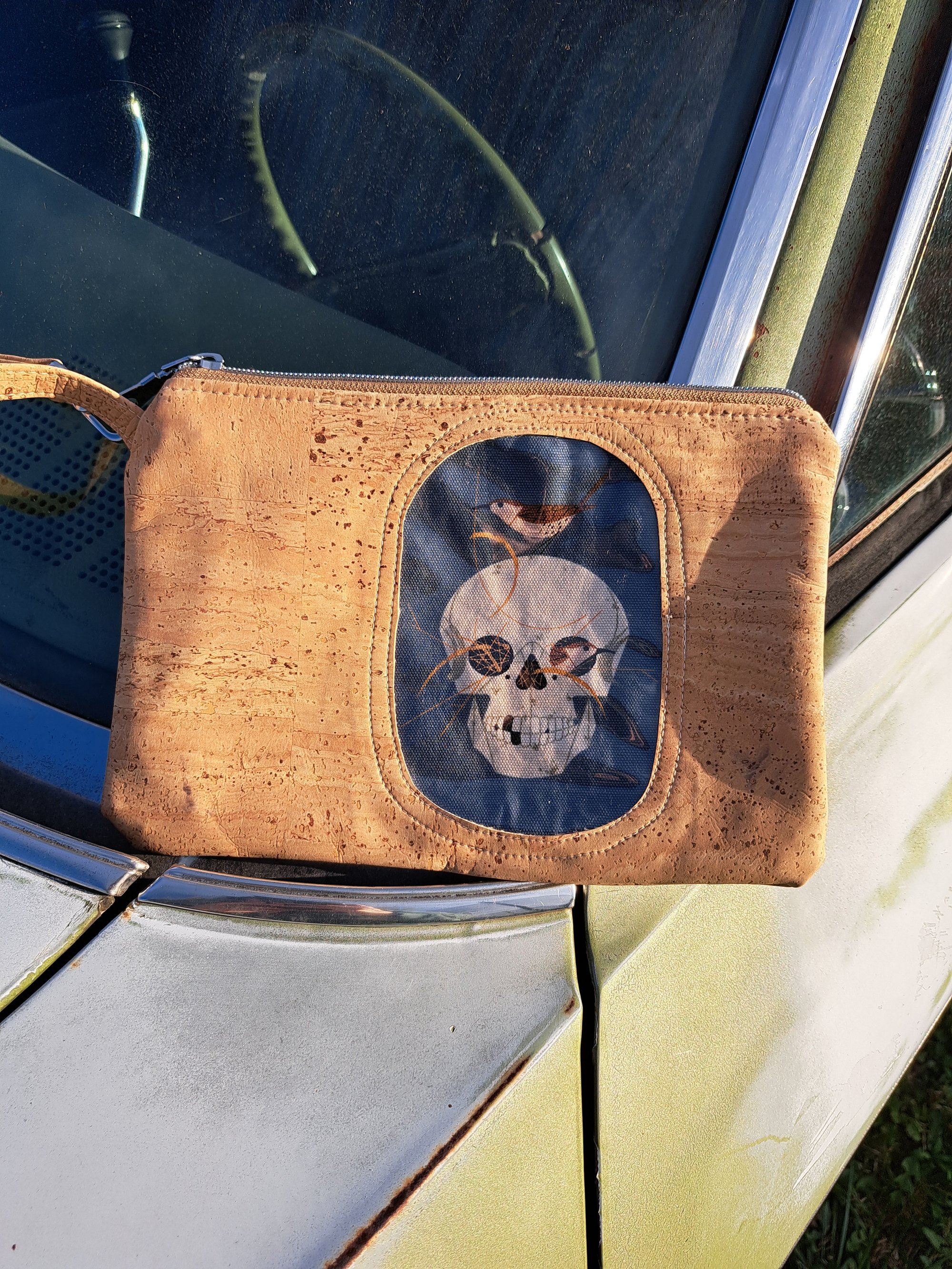 Retro Skull and Bird Organic Two Zip Crossbody Bag or Cork Wristlet